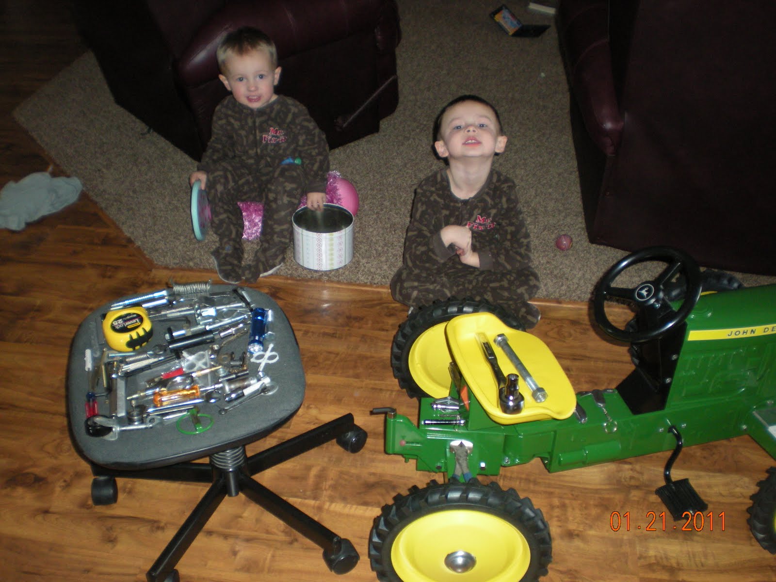 The tool box (or a tin can my parents got from someone for Christmas that Kyden found and uses as a tool box--which now have dents all over in it--oops!!